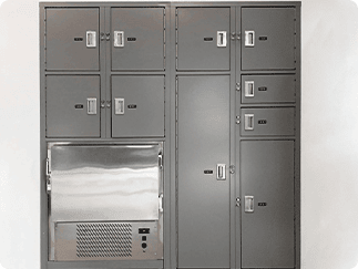 Evidence Lockers provide tamper-evident storage for law enforcement, featuring customizable chain of custody controls, multiple lock types, and specialized compartments. These lockers are available in pass-through configurations and refrigerated units for sensitive materials.